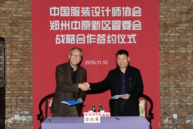 中国服装设计师协会主席李当岐与郑州中原新区管理委员会常务副主任苏西刚共同签署战略合作协议